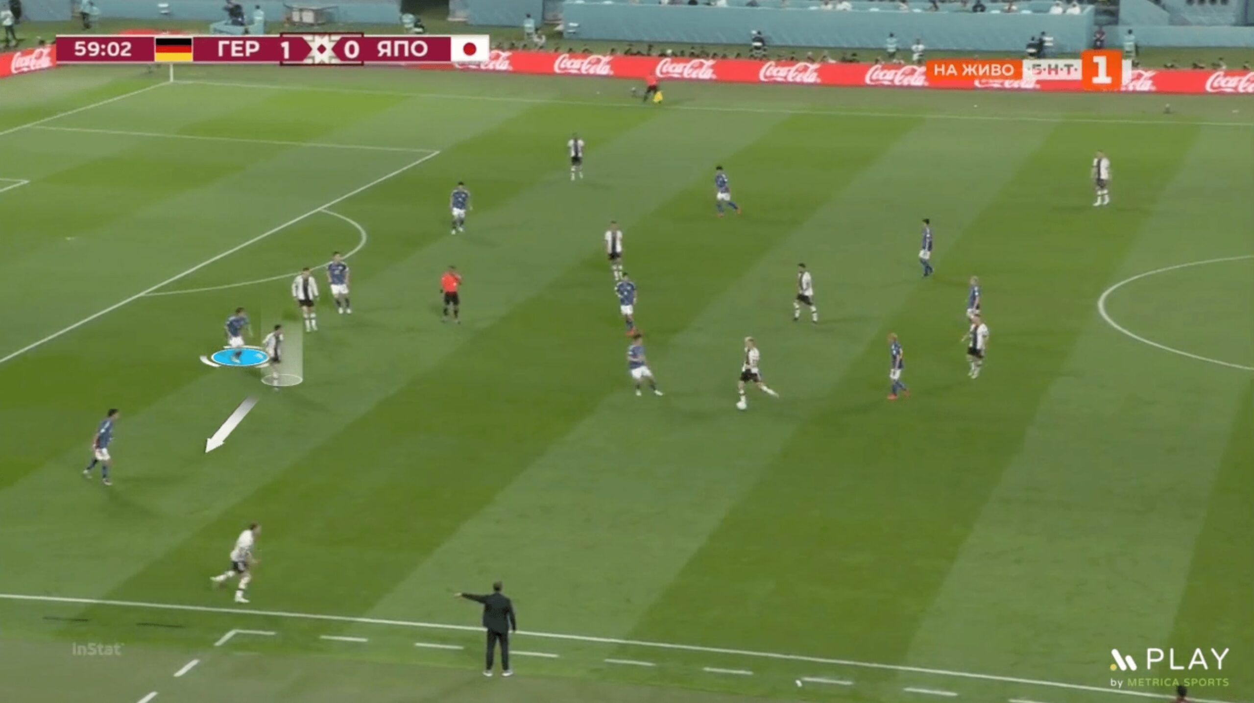 In Germany’s match against Japan, Musiala was often seen making explosive movements and runs to pick up the ball in tight space. Other times, his movements without the ball created doubts among the Japanese right side of their defensive structure (winger, full back, center back and holding midfielder) and served his teammates by granting them more space to receive the ball and continue the dangerous attack. In this example, Musiala does just that in perfect composure. Being located in the middle of Japan’s defensive line, he opens up to the wing and the Japanese center-back follows him. As a result, Musiala’s teammate is able to find Kai Havertz and rapidly pass him the ball. Musiala performs an explosive run and receives Havertz’s pass and to continue Germany’s attack. Again, this action shows Musiala’s outstanding game understandinge along his perception skills to understand the different opportunities of the game. In other occasions, he was able to drag the right back inside to allow Raum (Germany’s left back) make deep runs at the back of the Japanese right back.